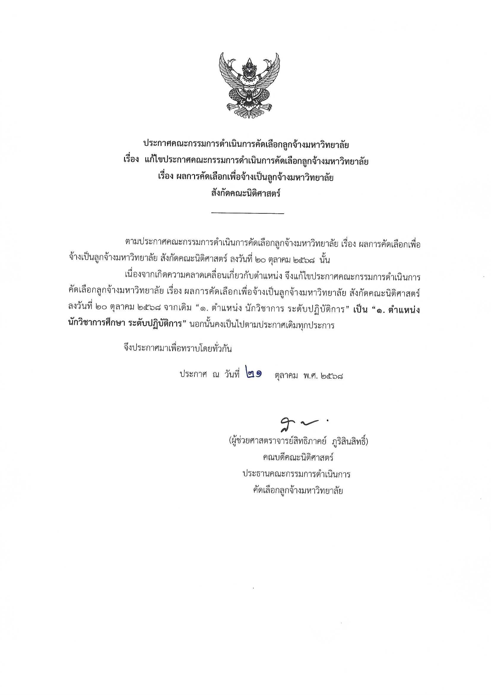 เรื่องแก้ไขประกาศคณะกรรมการดำเนินการคัดเลือกเพื่อจ้างเป็นลูกจ้างมหาวิทยาลัย