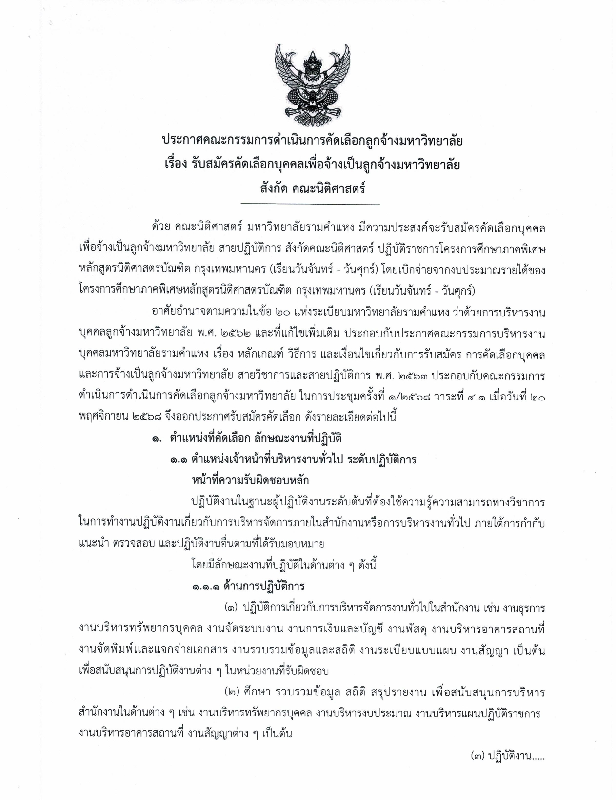 คณะนิติศาสตร์ มหาวิทยาลัยรามคำแหง โครงการศึกษาภาคพิเศษหลักสูตรนิติศาสตรบัณฑิต กรุงเทพมหานคร (เรียนวันจันทร์ - วันศุกร์) เปิดรับสมัครคัดเลือกบุคคล เพื่อจ้างเป็นลูกจ้างมหาวิทยาลัย สังกัดคณะนิติศาสตร์ (2 อัตรา)Written by ผู้ดูแลระบบ | | | Hits: 211 Tweet คณะนิติศาสตร์ มหาวิทยาลัยรามคำแหงโครงการศึกษาภาคพิเศษหลักสูตรนิติศาสตรบัณฑิต กรุงเทพมหานคร (เรียนวันจันทร์ - วันศุกร์)เปิดรับสมัครคัดเลือกบุคคล เพื่อจ้างเป็นลูกจ้างมหาวิทยาลัย สังกัดคณะนิติศาสตร์ (2 อัตรา)รายละเอียดคลิก